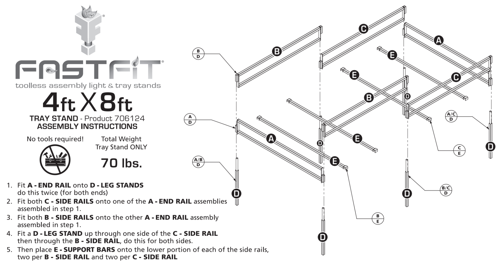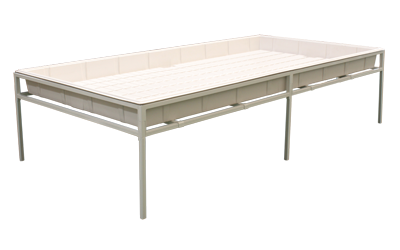 The Fast Fit is a heavy duty 4' x 8' quick assembly tray stand. Absolutely no tools required. Can be assembled in 5 minutes or less. Accommodates all popular brand (ID) inside dimension trays and reservoirs including Flo-n-Gro, Duralastics, Botanicare and more. Overall height is 25 in. Height from bottom bar to floor is 18 in without casters. Outside dimensions: 102 in length x 53 in wide. Inside dimensions: 100 in length x 51 in wide. Tray sold separately and may fit differently depending on brand.
