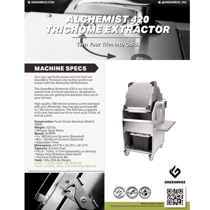 The GreenBroz Alchemist 420 Dry Sifter Commercial Tumbler/Trichome Extractor is solvent-free and can be operated with or without pulverized dry ice. Just insert your trim (and pulverized dry ice if you desire) and turn the Alchemist 420 on. Within minutes you'll see the glass panels turning a beautiful gold from the trichomes. The GreenBroz Alchemist 420 Dry Sifter Commercial Tumbler/Trichome Extractor will save you time, money, and labor while being quiet and efficient. If you want the most out of your harvest, look no further than the Alchemist 420!