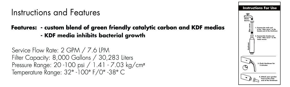 Compact garden hose filter. Eco-friendly green coconut carbon and KDF55 medias. Includes "filter saver" brass hose bib connector. Customized flow restrictor allows ideal contact time with filtration media to maximize reduction of chlorine, tastes and odors, sediment, volatile organic compounds, chemicals, and rust and iron particles. KDF media inhibits bacterial growth. Fast flow rates of 2 GPM and long filter life of 8,000 Gallons. Recyclable plastic.
