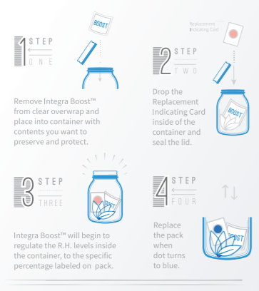 The Integra BOOST pack will continue to modulate the humidity—adjusting humidity levels as needed (i.e. if the container is opened and closed) to keep the relative humidity at the tested perfect levels of either 55% or 62% RH. The circular dot on the included Replacement Indicator Card will turn from red to blue when it's time to replace your Integra BOOST pack with a fresh one.