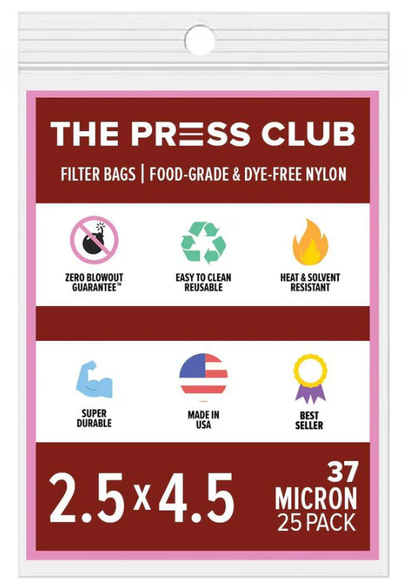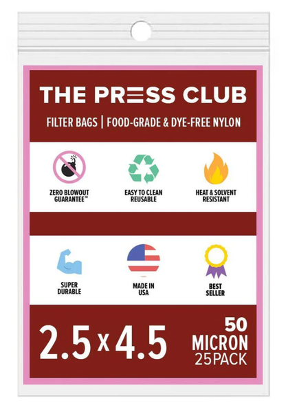 The Press Club 2.5" x 4.5" Rosin Bags deliver a professional-grade solution for enthusiasts and experts alike. Built to withstand intense pressure and temperatures up to 375 °F, each bag features the Press Club's proprietary pink stitch, minimizing blowouts and boosting performance. Constructed from premium, food-grade nylon sourced in the USA, these bags ensure purity and safety in every press, while their high-quality construction reduces soakage and enhances yields.