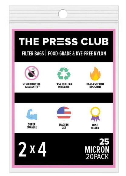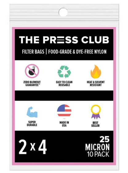 The Press Club 2" x 4" Rosin Bags - 90 Micron (10 pack) are designed specifically for extracting rosin from flower, providing excellent filtration while capturing essential oils for a high-quality yield. Constructed from 100% food-grade nylon, these bags are reinforced with The Press Club's proprietary pink stitching, ensuring durability against high pressure (over 20 tons) and heat up to 375 °F. The zero blowout guarantee backs up this sturdy design, offering peace of mind in every pressing session.