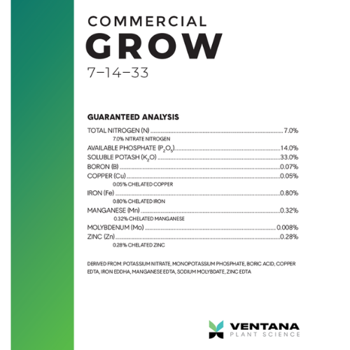 Ventana Plant Science Commercial Grow (7-14-33) is the cornerstone of our Commercial Program's base vegetative nutrient, specifically formulated to promote vigorous vegetative growth and reduce excessive internodal stretching. This spray-dried nutrient powder dissolves quickly and completely into stock solutions, leaving no leftover tank precipitates. To provide a complete vegetative base nutrient solution, this product requires the addition of VPS Calcium Nitrate and Magnesium Sulfate.